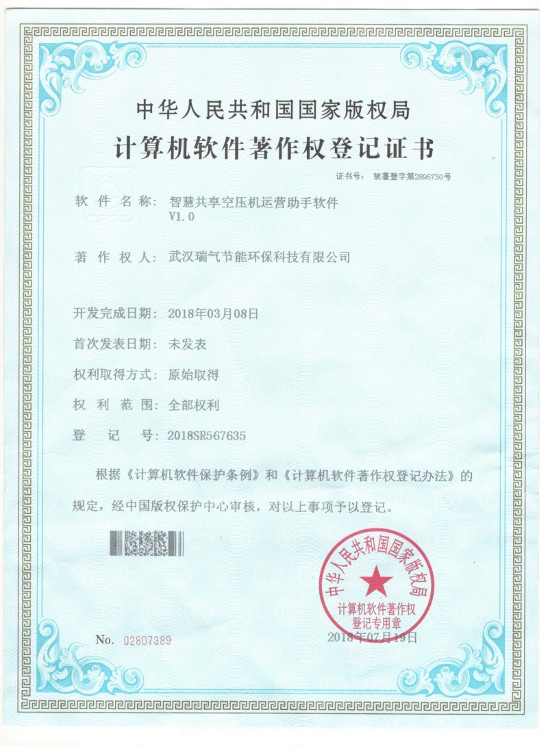 软件著作权登记证书(智慧共享空压机运营助手软件)